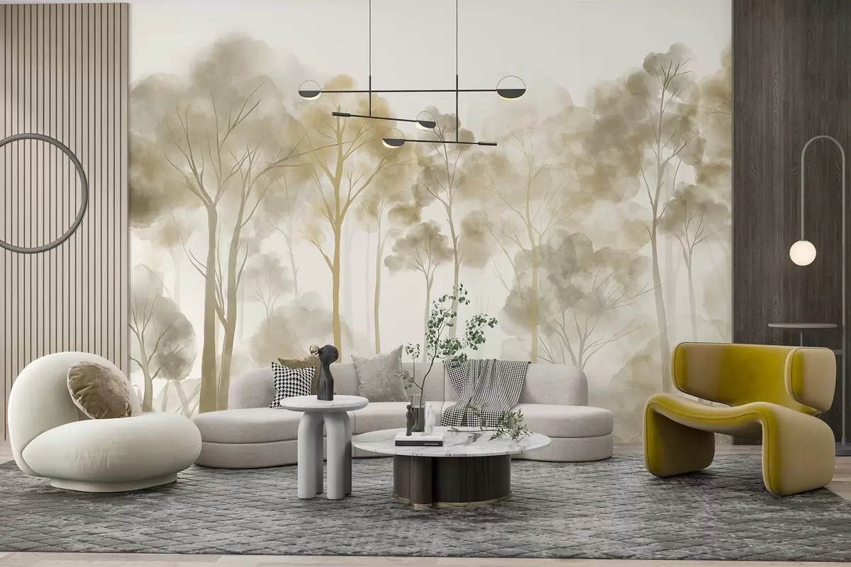 Фотошпалери Акварельний ліс з високими світлими деревами у відтінках бежевого та жовтого, з туманною атмосферою w08870