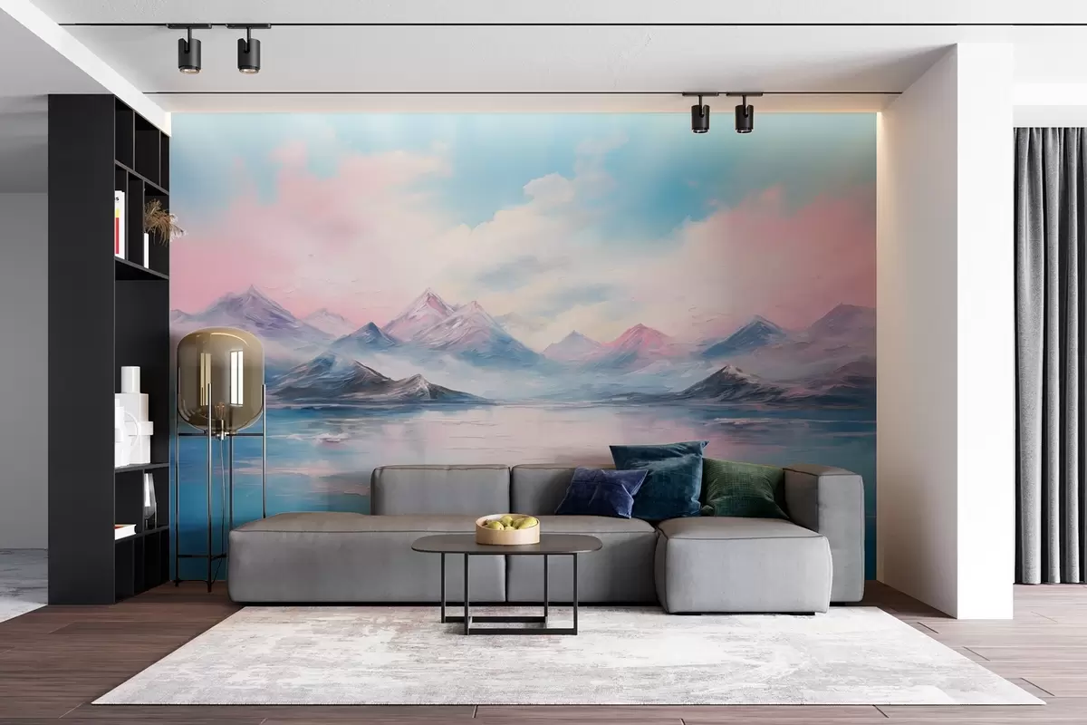 Фотошпалери Барвистий пейзаж у рожево-блакитних тонах з горами, озером і хмарами, виконаний у стилі мазка пензлем w08878