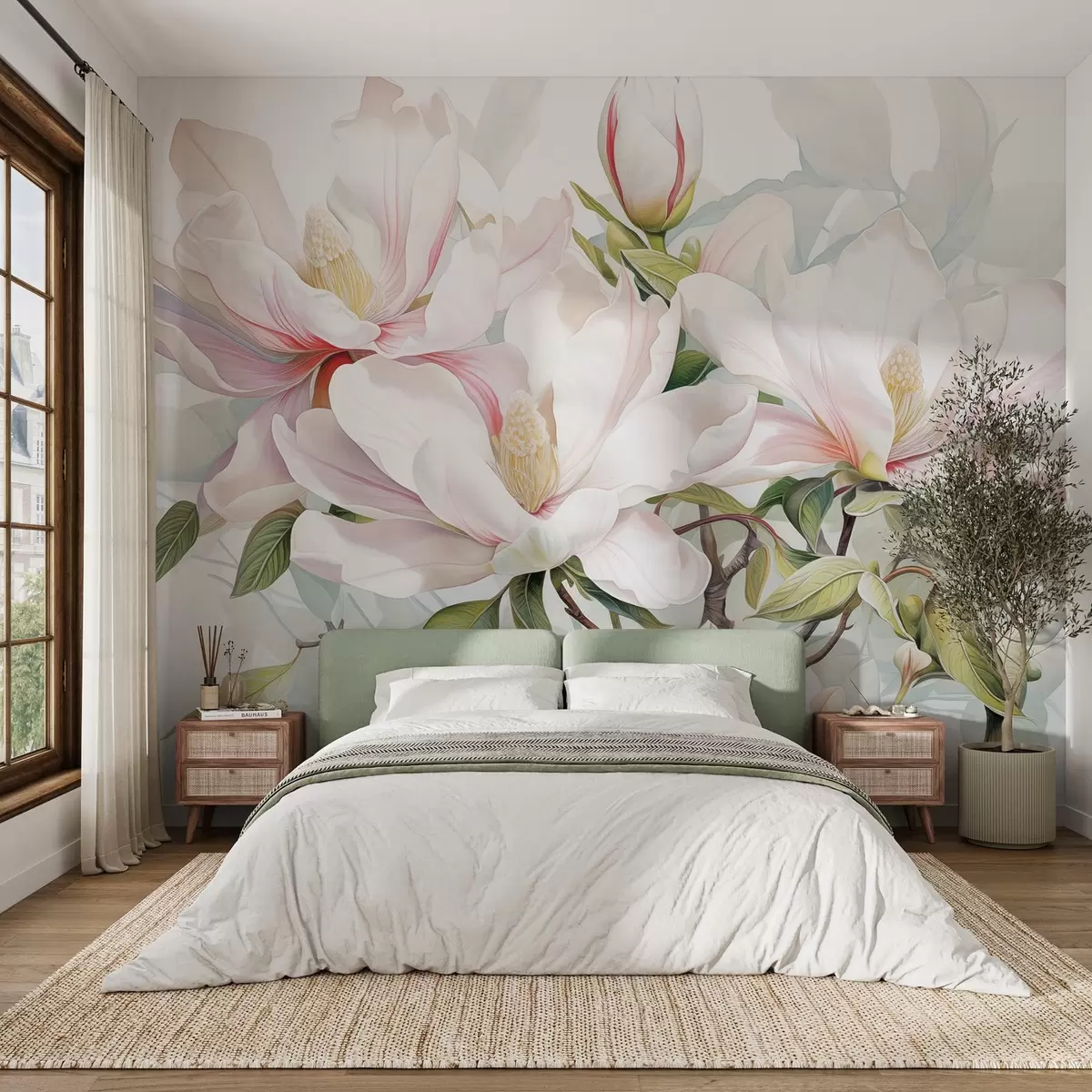 Фотошпалери Квіти магнолії з білими та рожевими пелюстками, листям і коричневими гілками, м'який і ніжний акварельний стиль w08885