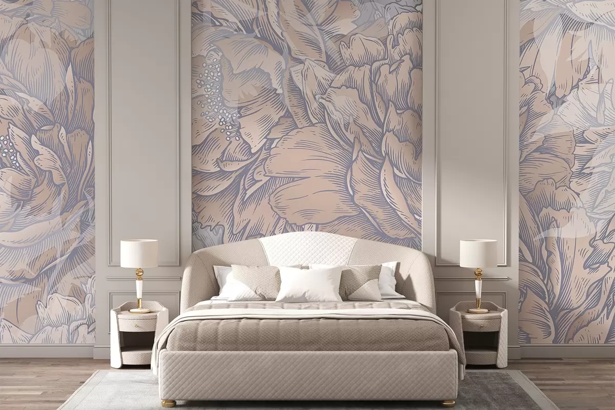 Фотошпалери Квіти півонії з деталізованими пелюстками та тичинками, м'які пастельні кольори, вінтажний стиль ботанічної ілюстрації w08890