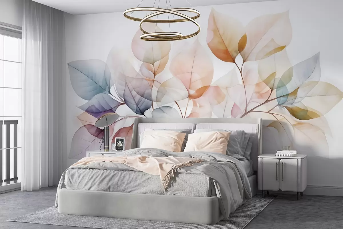 Фотошпалери Акварельний живопис напівпрозорого листя в пастельних тонах, з відтінками рожевого, білого, фіолетового та синього w08910