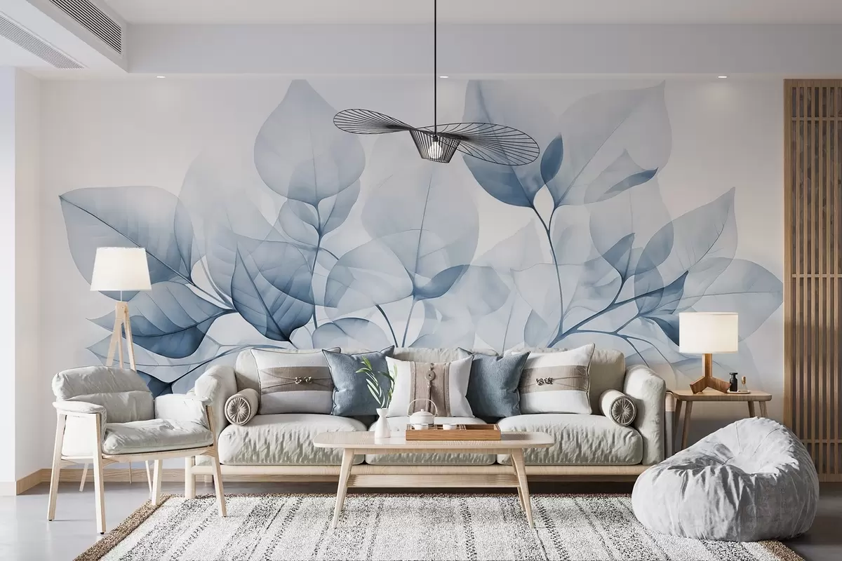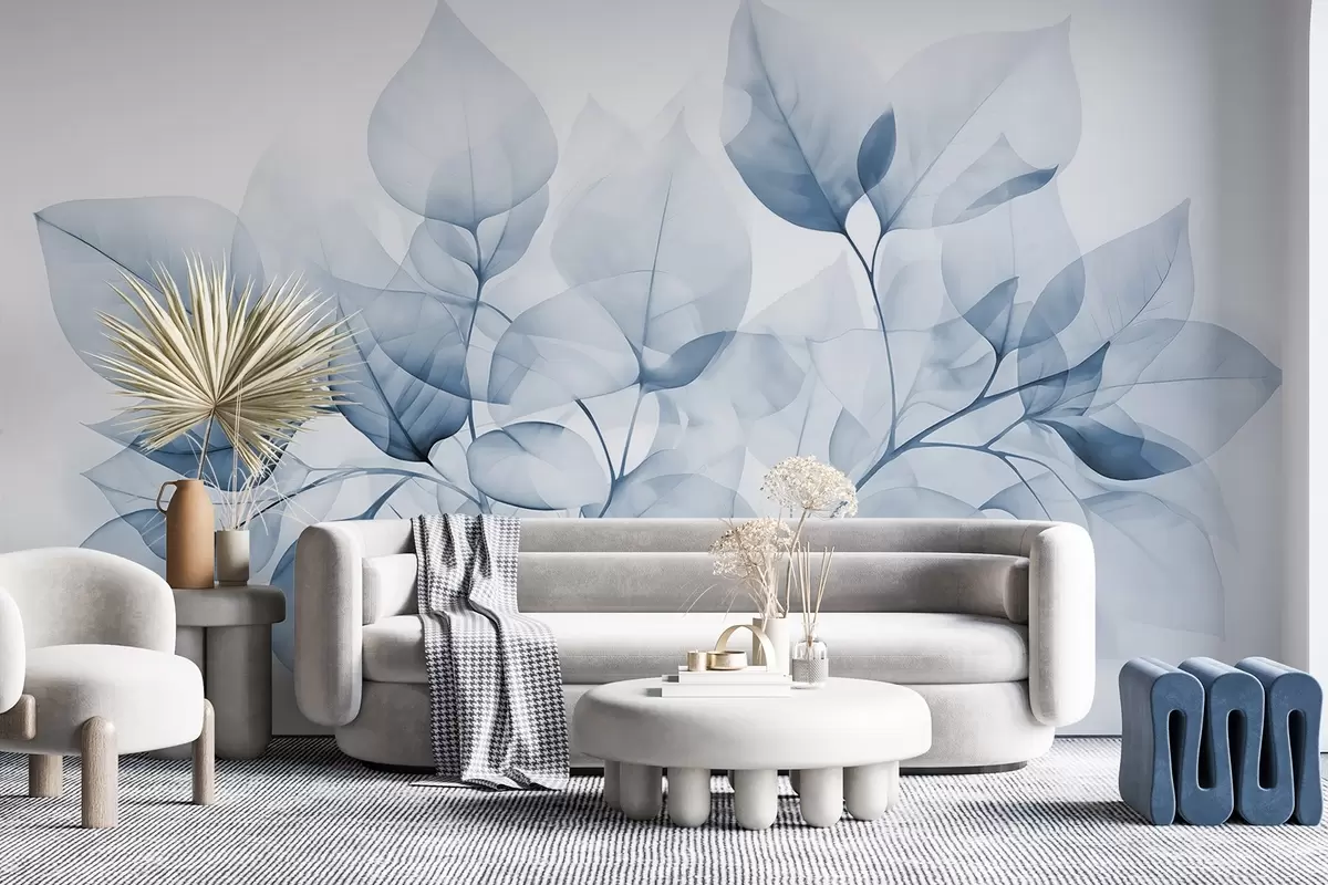 Фотошпалери Акварельний живопис напівпрозорого листя в пастельних тонах, з відтінками білого та синього w08910v1