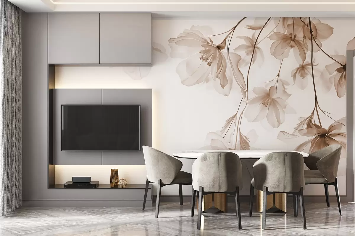 Фотошпалери Бежеві квіти з напівпрозорими пелюстками, що звисають з гілки, бежево-біла, мінімалістична сучасна художня композиція w08911v1