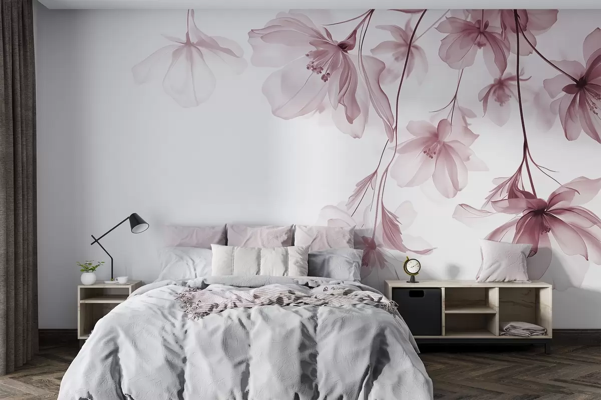 Фотошпалери Рожеві квіти з напівпрозорими пелюстками, що звисають з гілки, рожево-біла, мінімалістична сучасна художня композиція w08911v2