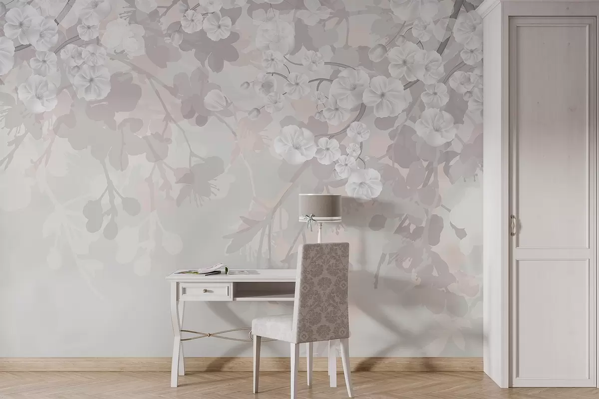 Фотошпалери Вишневі гілки з білими квітами та сірим листям на елегантних квіткових силуетах у м'яких пастельних тонах w08973v1