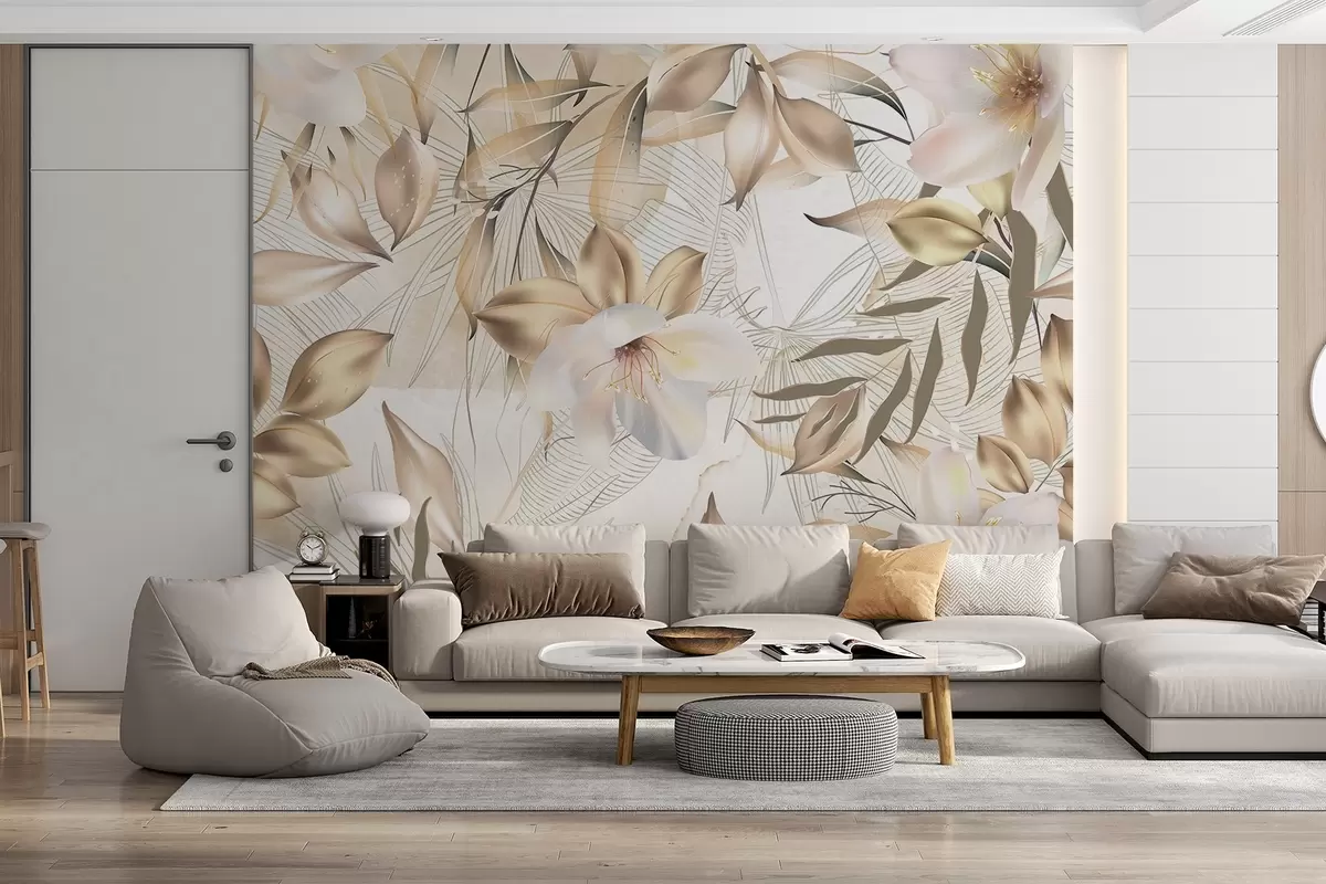 Фотошпалери Квіти та листя жасмину, м'які кольори, ботанічна ілюстрація, квітковий фон, елегантний дизайн, ніжні пелюстки w08977