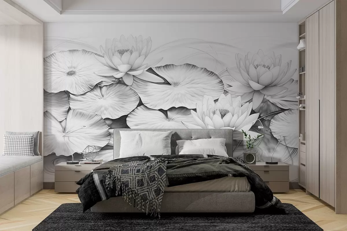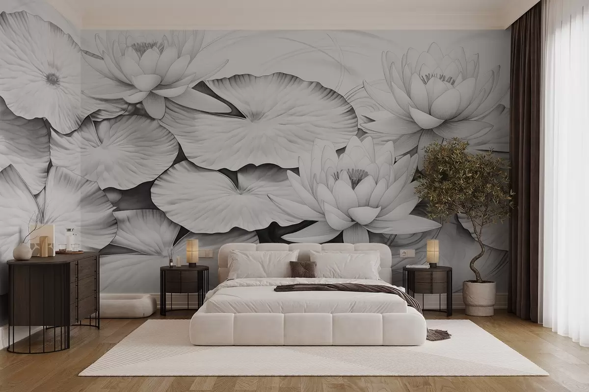 Фотошпалери Водяні лілії та подушечки лілій у ставку, чорно-біла імітація олівцевого малюнка, детальна ботанічна ілюстрація, мистецтво природи w09006