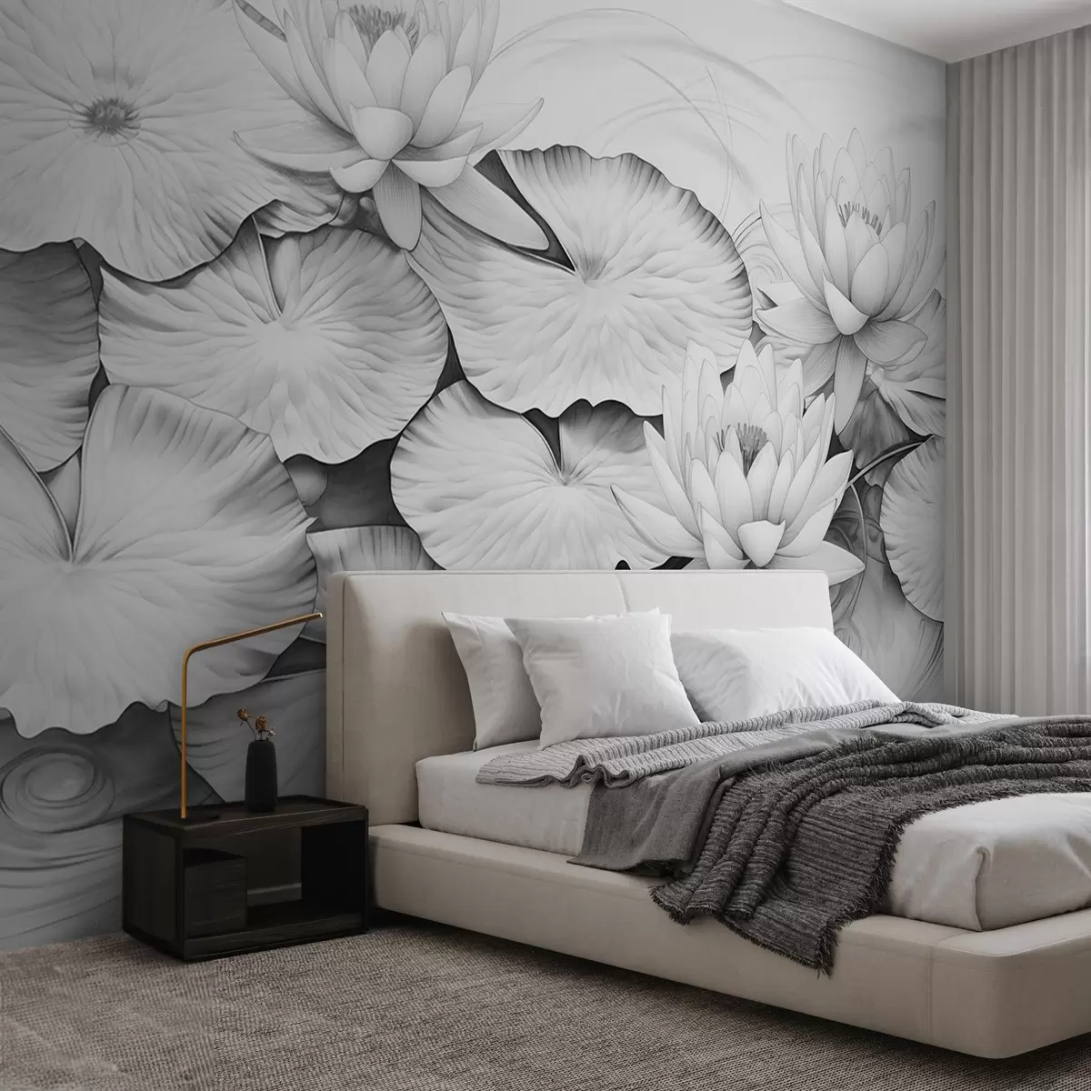 Фотошпалери Водяні лілії та подушечки лілій у ставку, чорно-біла імітація олівцевого малюнка, детальна ботанічна ілюстрація, мистецтво природи w09006
