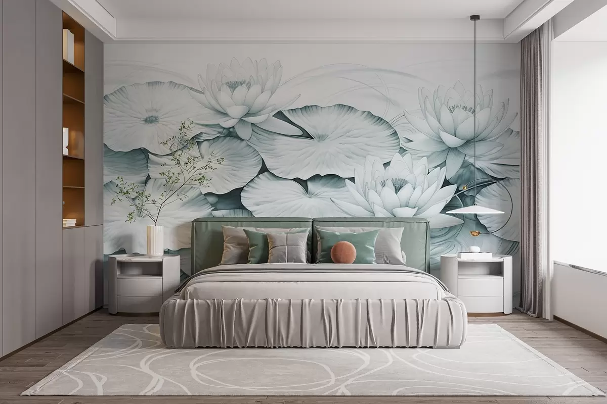 Фотошпалери Водяні лілії та подушечки лілій у ставку, бірюзово-біла імітація олівцевого малюнка, детальна ботанічна ілюстрація, мистецтво природи w09006v1