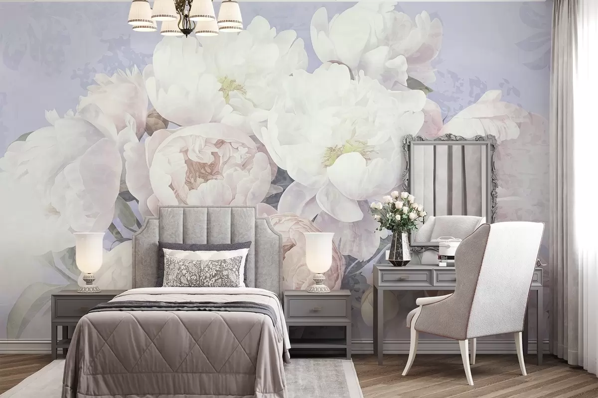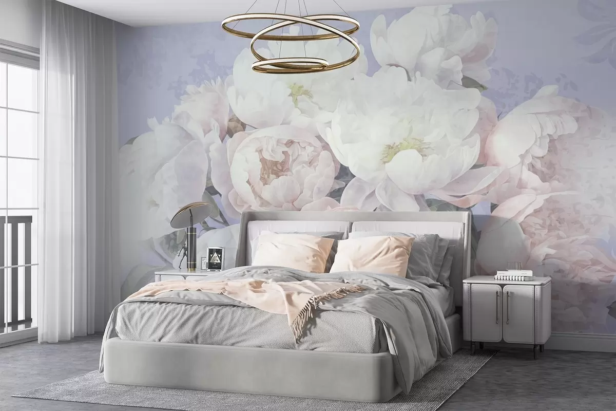 Фотошпалери Текстуровані абстрактні персикові та білі півонії з зеленим листям, світле тло, м'які та ніжні кольори, вінтажний стиль w09008v1