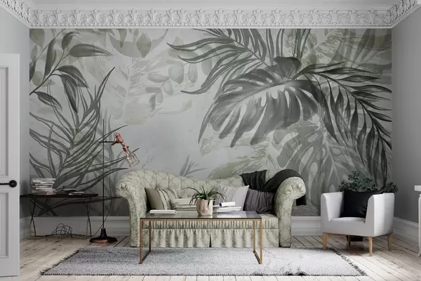 Фотошпалери Листя монстери та пальми у відтінках зеленого та сірого, ботаніка, тропічне листя, рослини джунглів, фактурне тло w09011
