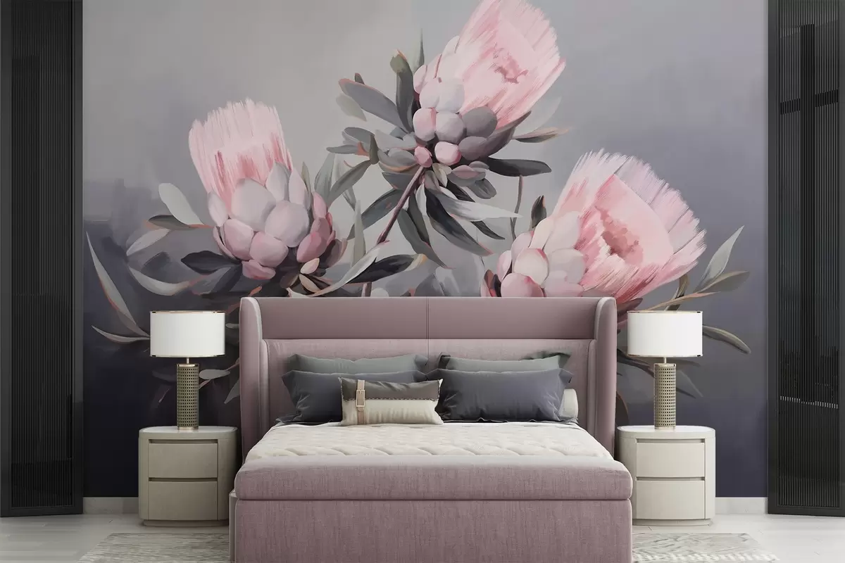 Фотошпалери Рожеві абстрактні квіти протеї з сірим листям, м'які фактурні мазки, приглушені кольори, на розмитому сірому тлі w09014