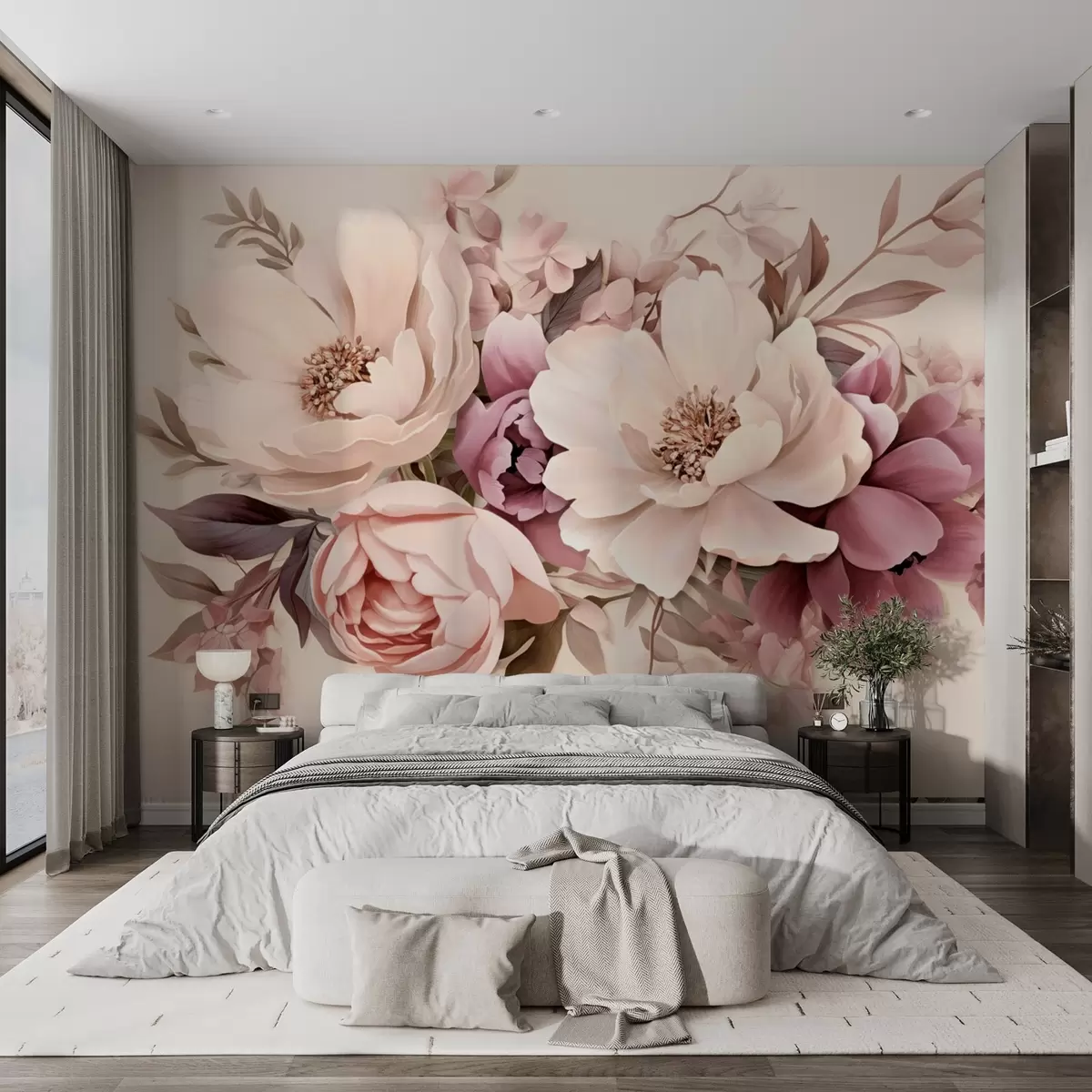Фотошпалери Ніжна композиція з рожевих і бежевих квітів, півоній з листям w09019