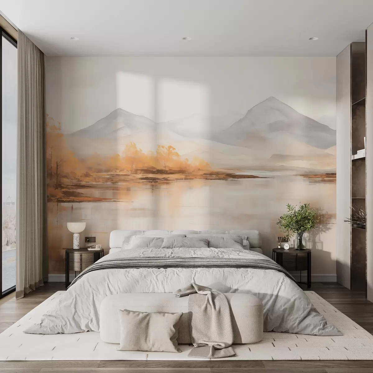 Фотошпалери Осінній пейзаж з жовтими деревами та річкою на тлі гір w09020