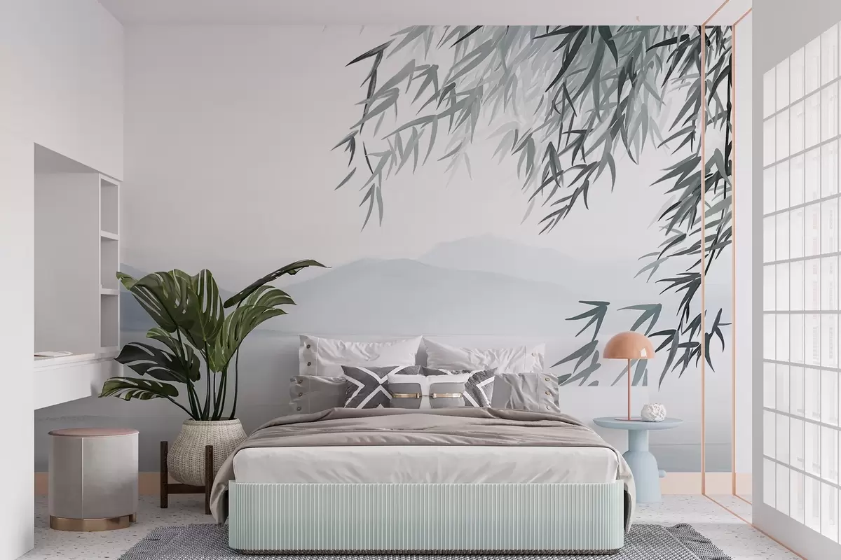 Фотошпалери Листя бамбука, що звисає над озером з горами на задньому плані, м'які блакитні та білі тони, стиль живопису тушшю w09048