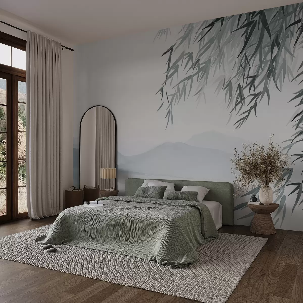 Фотошпалери Листя бамбука, що звисає над озером з горами на задньому плані, м'які блакитні та білі тони, стиль живопису тушшю w09048