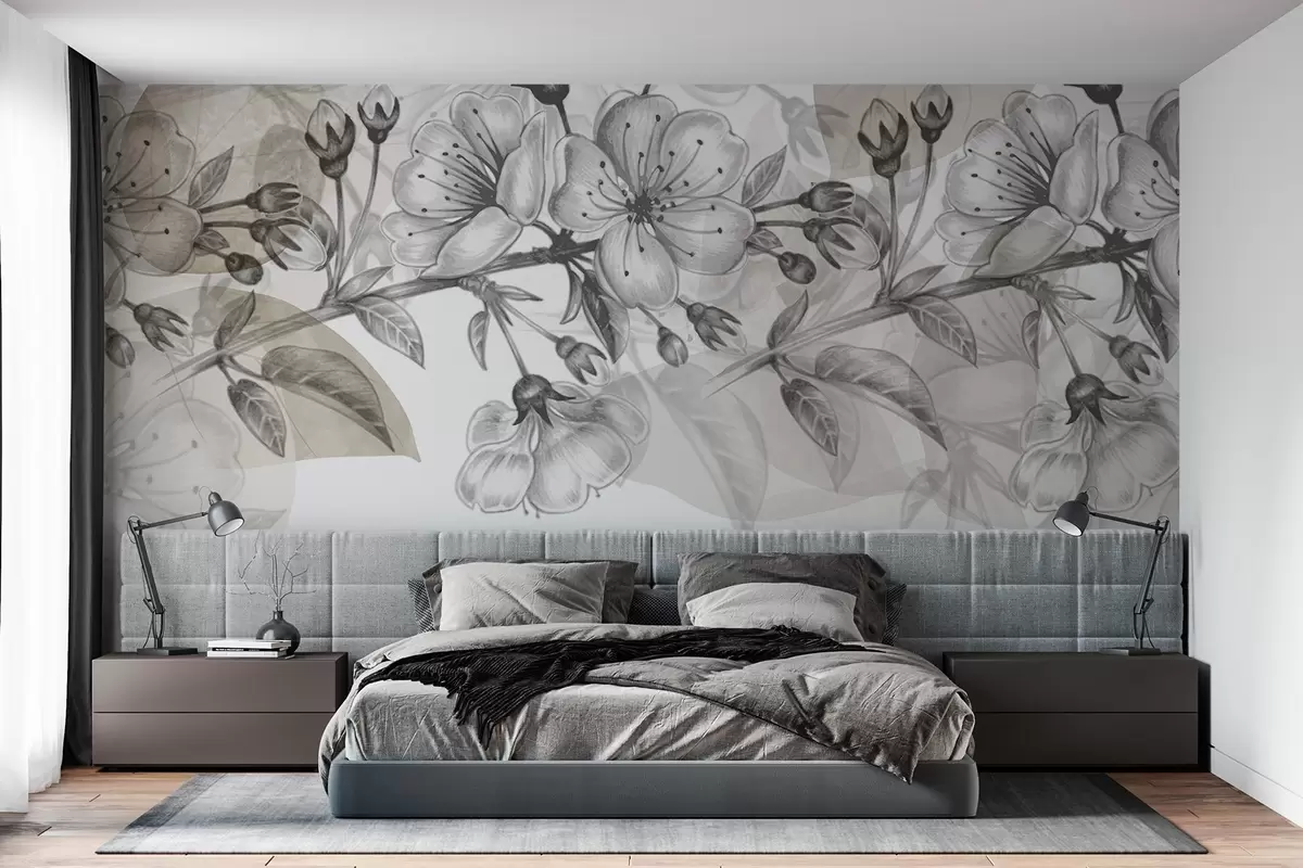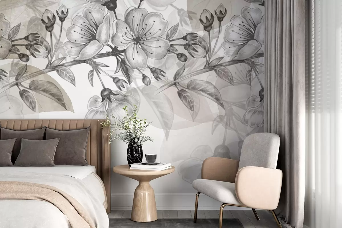 Фотошпалери Гілка вишні з квітами та бутонами, тони сепії, м'яке акварельне тло з сірими та коричневими відтінками w09051v1