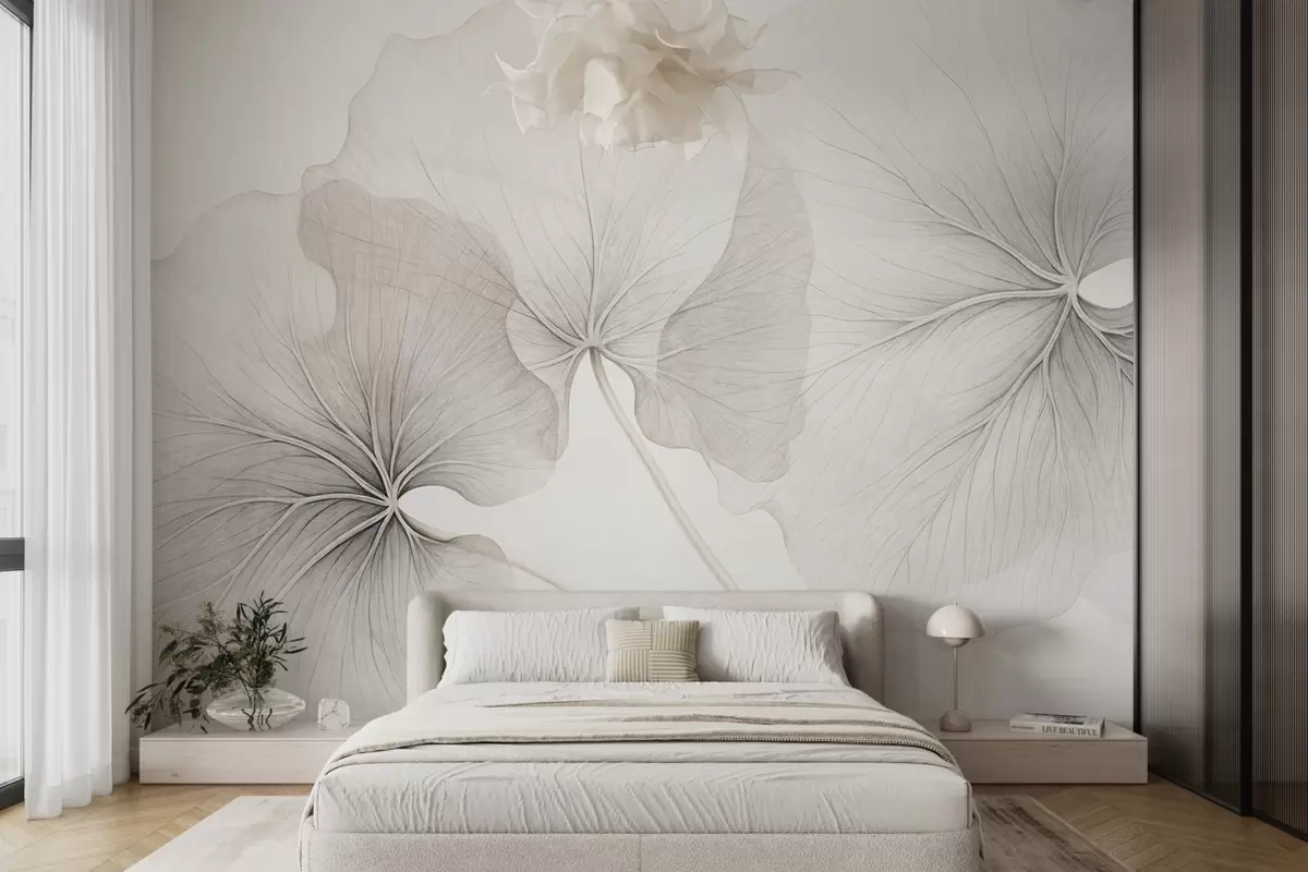 Фотошпалери Три напівпрозорі листки з видимими прожилками, з текстурою шуму, що злегка перекриваються, з тонкими стеблами на білому тлі w09052
