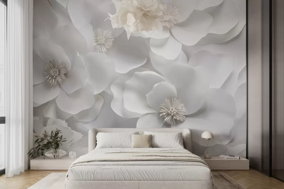 Фотошпалери Білі квіти з ніжними пелюстками, розташовані щільним гроном, створюють відчуття чистоти та елегантності на білому тлі w09053