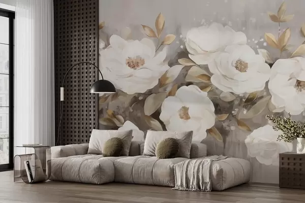 Фотошпалери Білі квіти з жовтим листям, м'які пелюстки, ніжна квіткова композиція, нейтральна палітра кольорів, фактурні мазки w09062