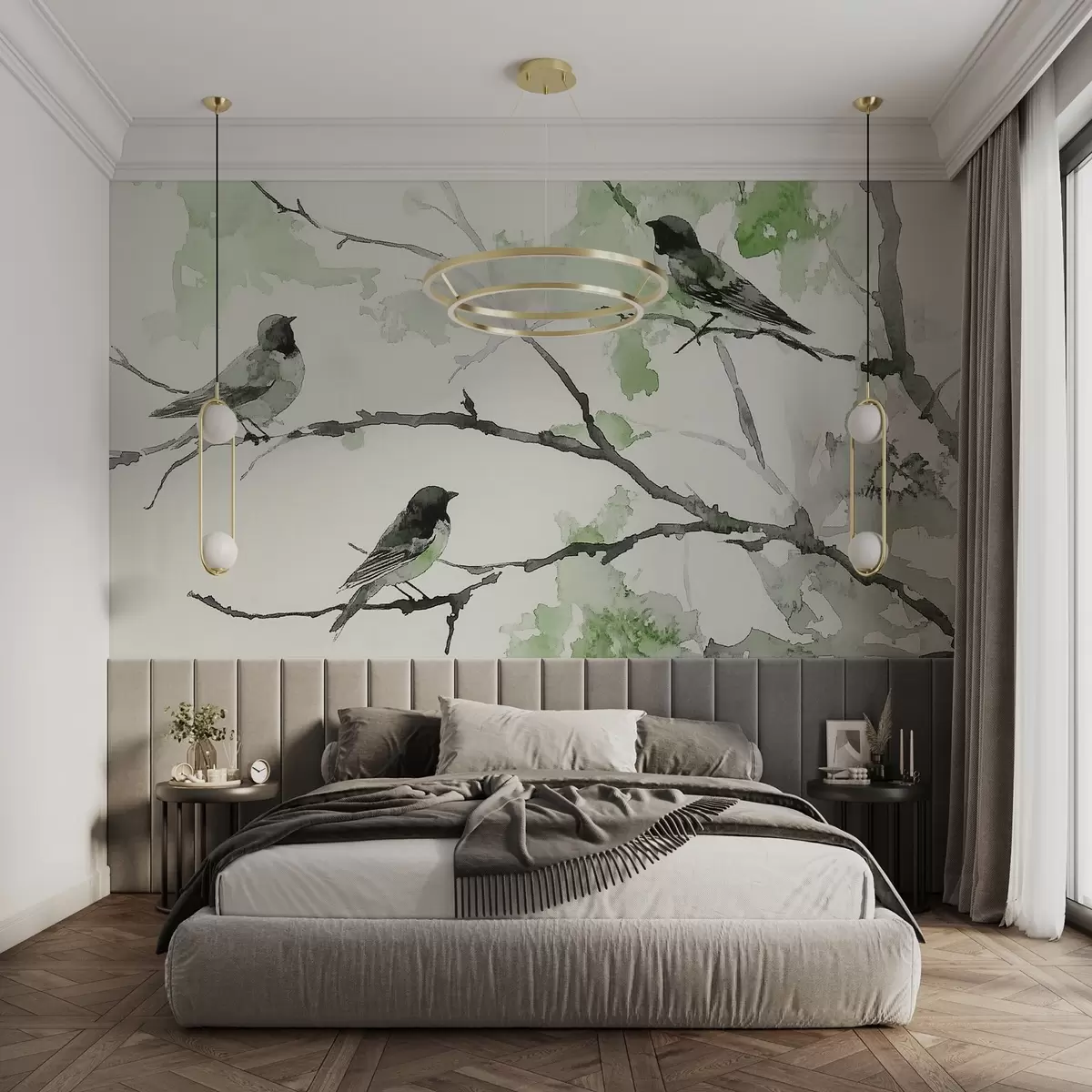 Фотошпалери Птахи на гілках дерев у стилі акварелі w09064v3
