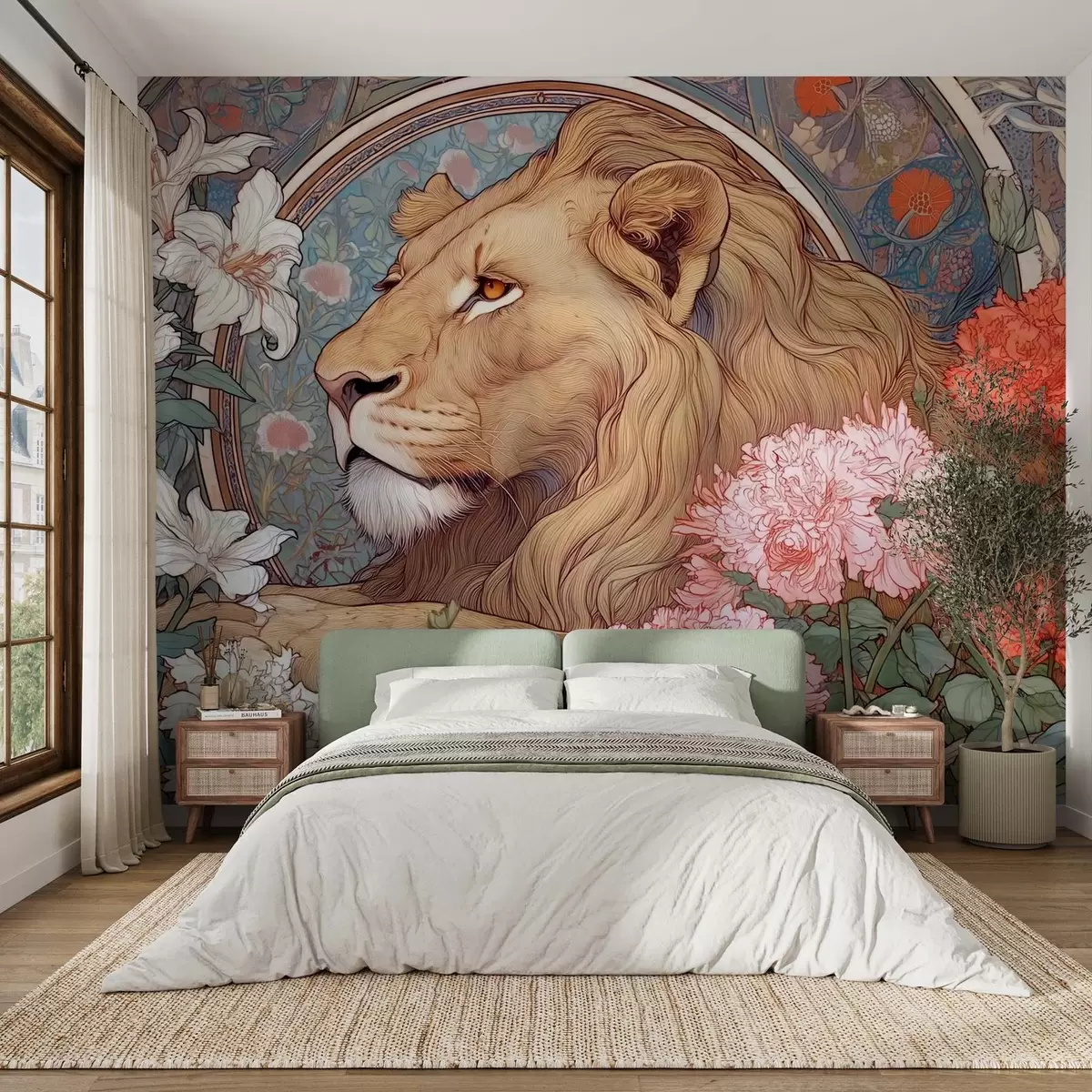 Фотошпалери Лев, оточений безліччю квітів у стилі Альфонса Мухи w09073