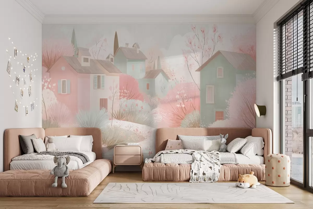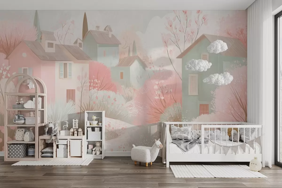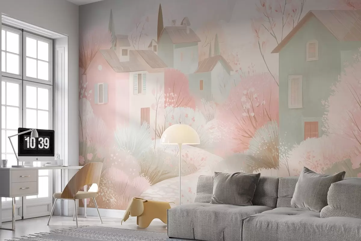Фотошпалери Казкове містечко в стилі олійного живопису в рожевих відтінках w09095
