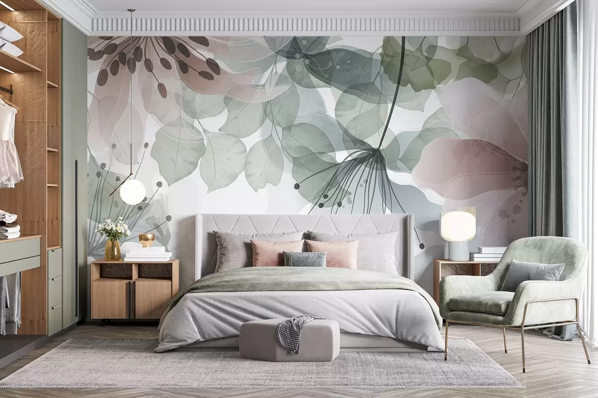 Фотошпалери Квіти та листя в пастельних тонах, напівпрозорі пелюстки та листя, м'який акварельний ефект, ніжні лінії, біле тло w09107
