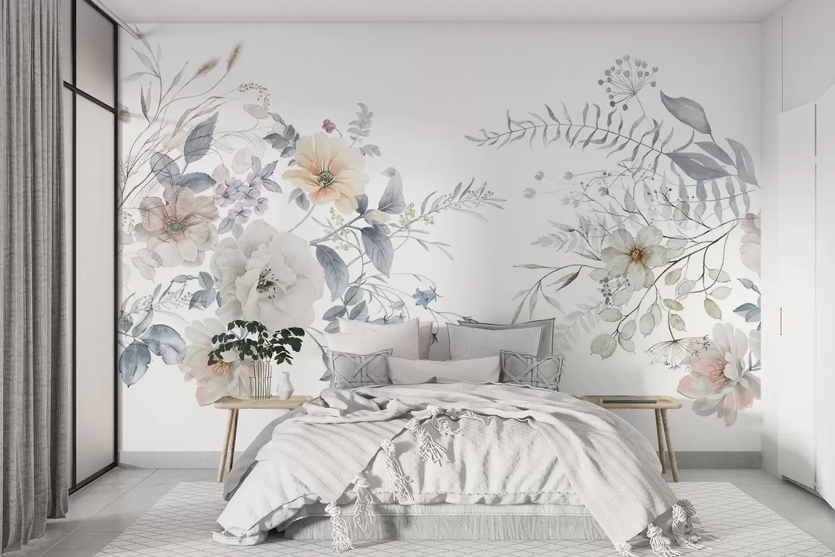 Фотошпалери Квіткова композиція в стилі акварельного живопису з білими, персиковими та блакитними квітами, ніжною зеленню на білому тлі w09108