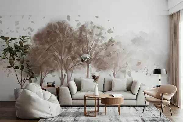 Фотошпалери Абстрактний пейзаж з деревами з коричневим листям, що віддзеркалюється у воді, в акварельному фактурному стилі w09109v1