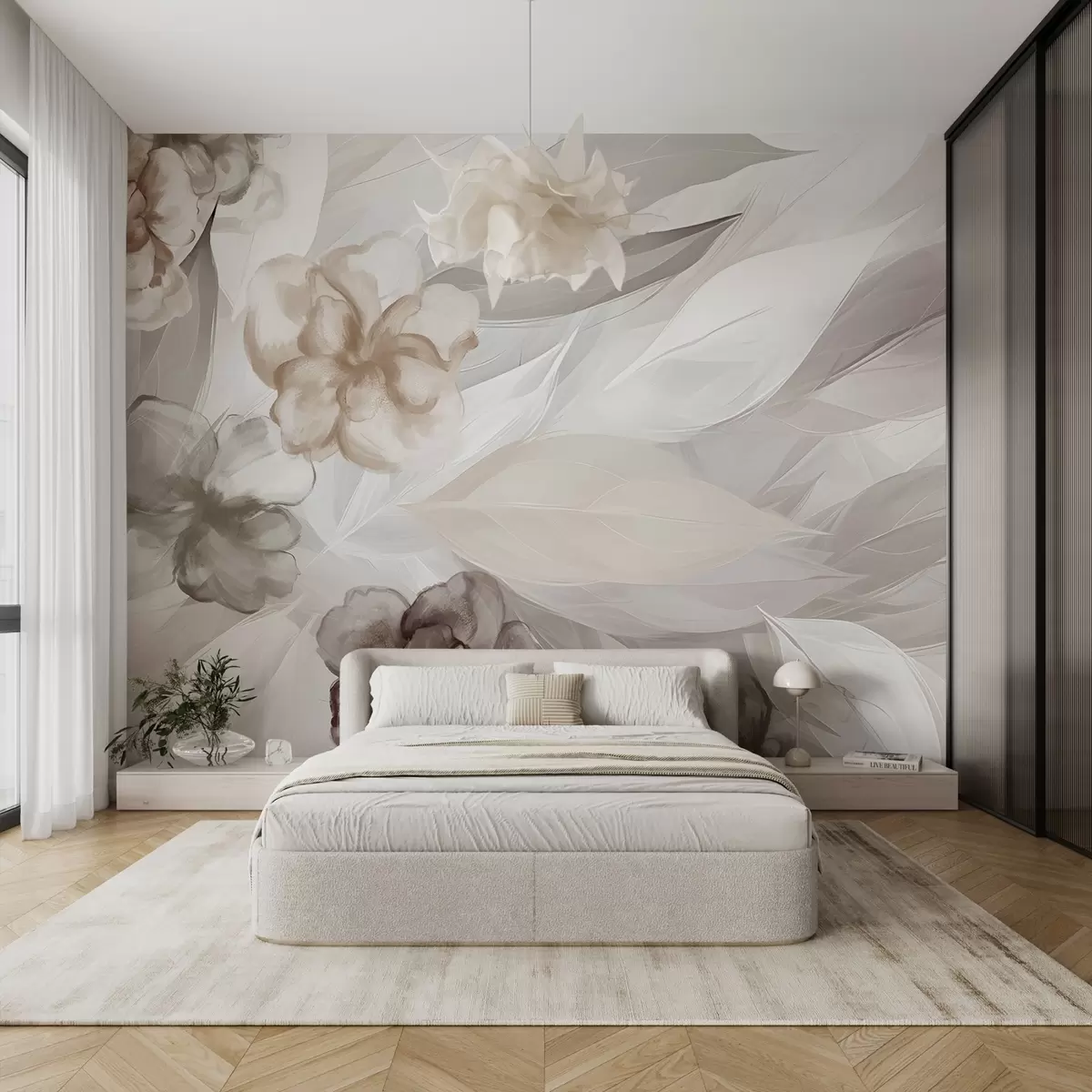 Фотошпалери Ніжні квіти та листя у відтінках білого, коричневого та бежевого квіткового фону, м'які кольори, ніжні пелюстки w09111v1