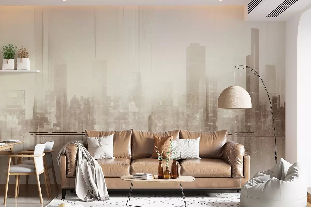 Фотошпалери Абстрактний фактурний міський пейзаж з високими будівлями та смугами, у відтінках бежевого та білого, що створюють ефект туману w09119v1