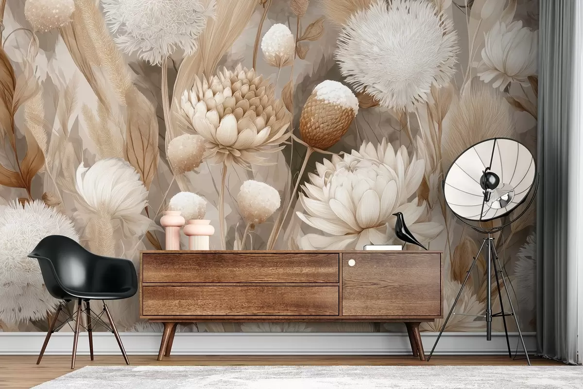 Фотошпалери Бохо Гармонія: Текстуровані квіти в бежево-кремових тонах w09121