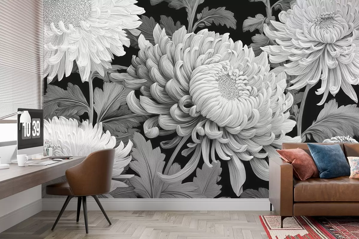 Фотошпалери Чорно-білі великі орхідеї з листям w09125v1