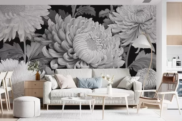 Фотошпалери Чорно-білі великі орхідеї з листям w09125v1