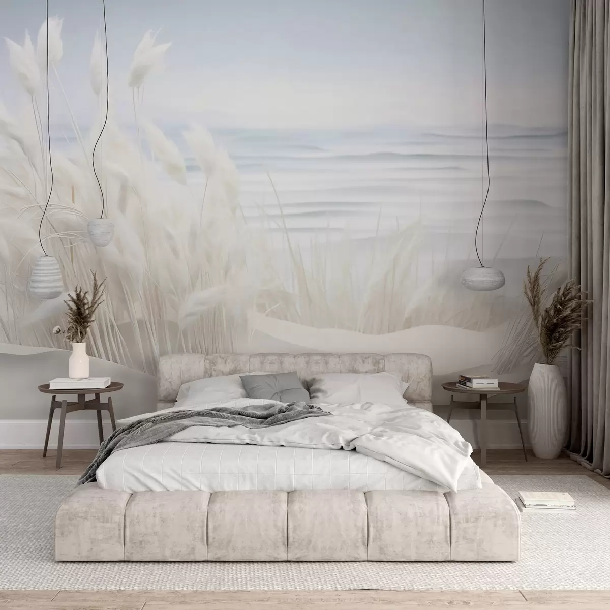 Фотошпалери Пейзаж з білою пампасною травою на піщаній дюні, на тлі світло-блакитного океану, м'який, мінімалістичний стиль w09132