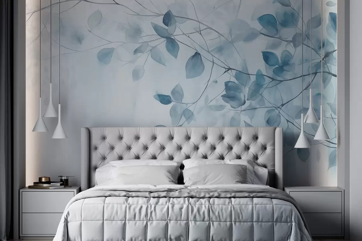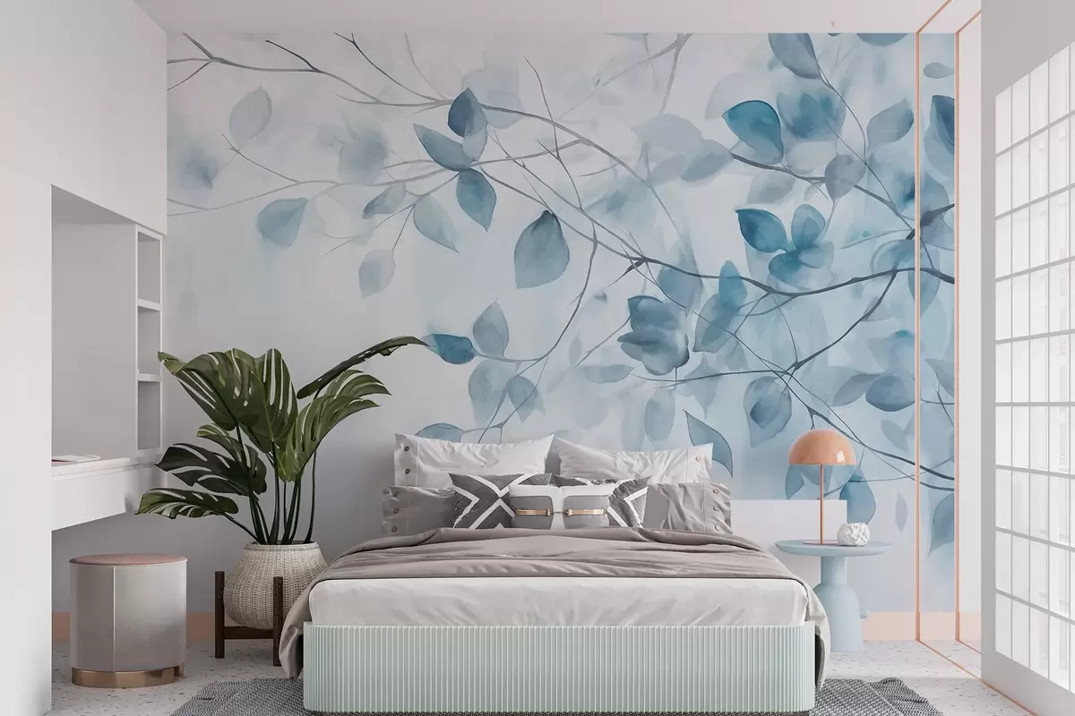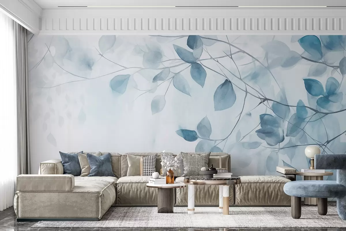 Фотошпалери Текстурний акварельний живопис з імітацією синього листя та гілок, м'які кольори, ніжні деталі на білому тлі w09133v1