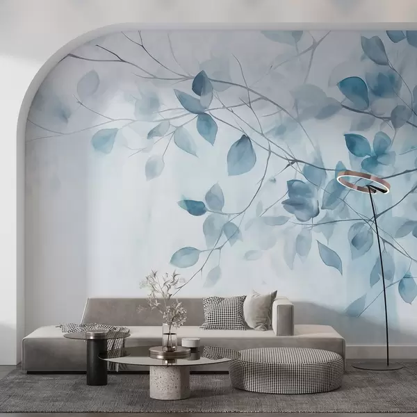 Фотошпалери Текстурний акварельний живопис з імітацією синього листя та гілок, м'які кольори, ніжні деталі на білому тлі w09133v1