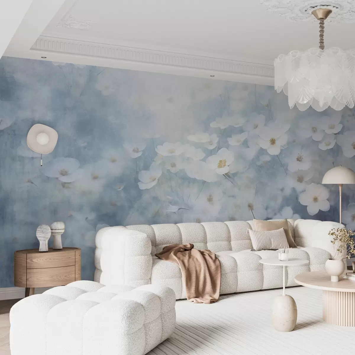 Фотошпалери Текстурне поле білих квітів анемони, м'який фокус, мрійлива атмосфера, блакитно-біла палітра кольорів, весняний луг w09134