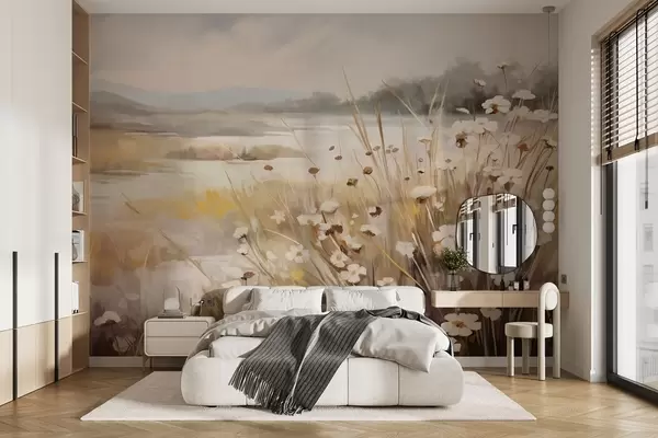 Фотошпалери Поле високої трави та білих ромашок, дерева на задньому плані, під хмарним небом, фактурний пейзаж, м'які мазки w09139