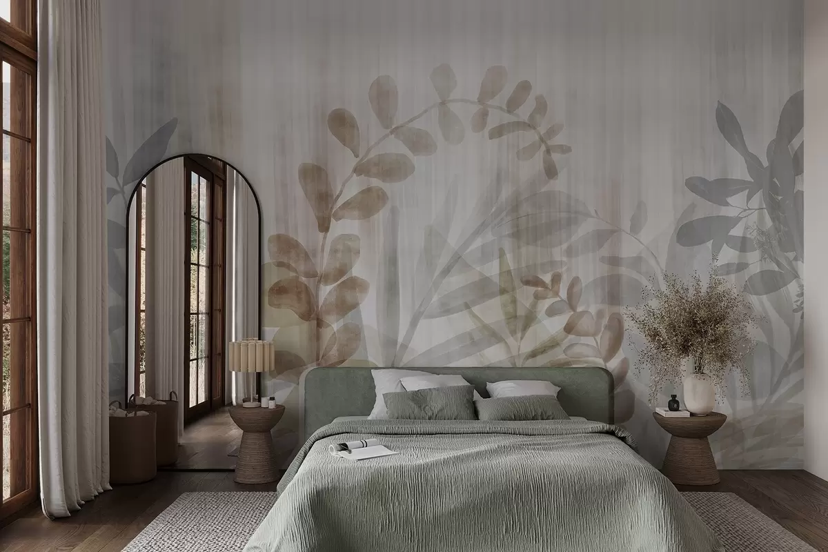 Фотошпалери Акварельний живопис, що імітує рослини з різнокольоровим приглушеним листям, світле тло з вертикальними лініями, ботанічна ілюстрація w09146