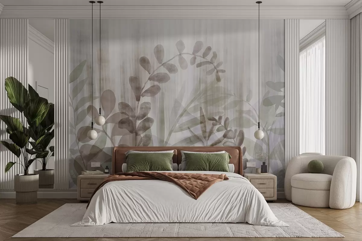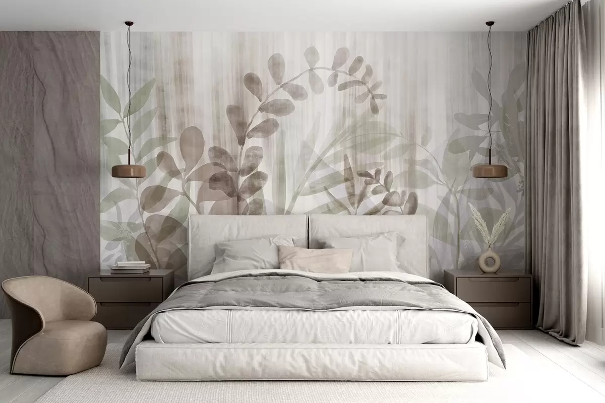 Фотошпалери Акварельний живопис, що імітує рослини з різнокольоровим приглушеним листям, світле тло з вертикальними лініями, ботанічна ілюстрація w09146v1