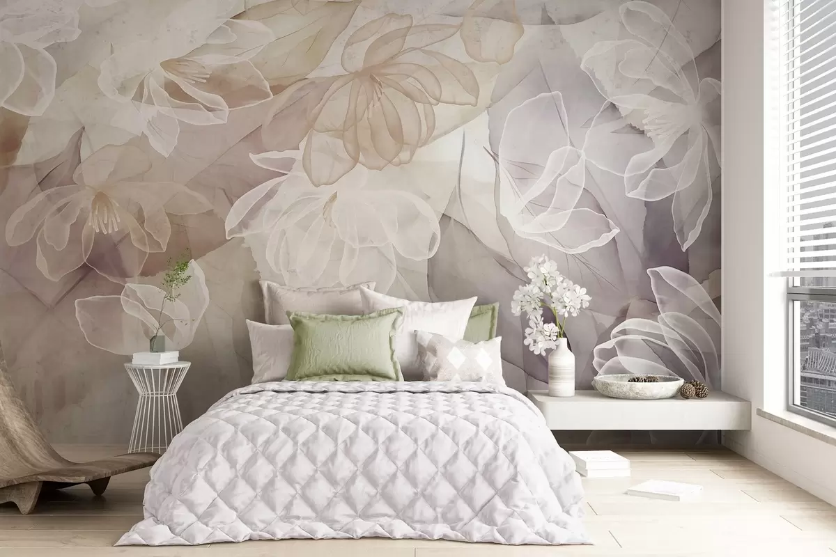 Фотошпалери Квіти і листя з прозорими пелюстками у відтінках білого, бежевого і фіолетового, м'які і ніжні w09158