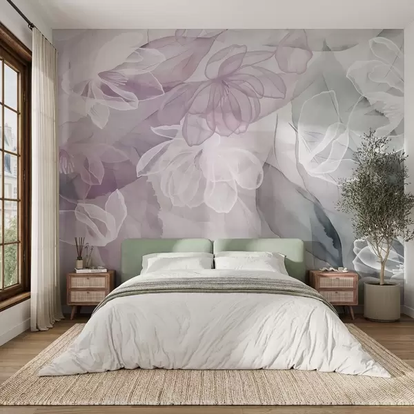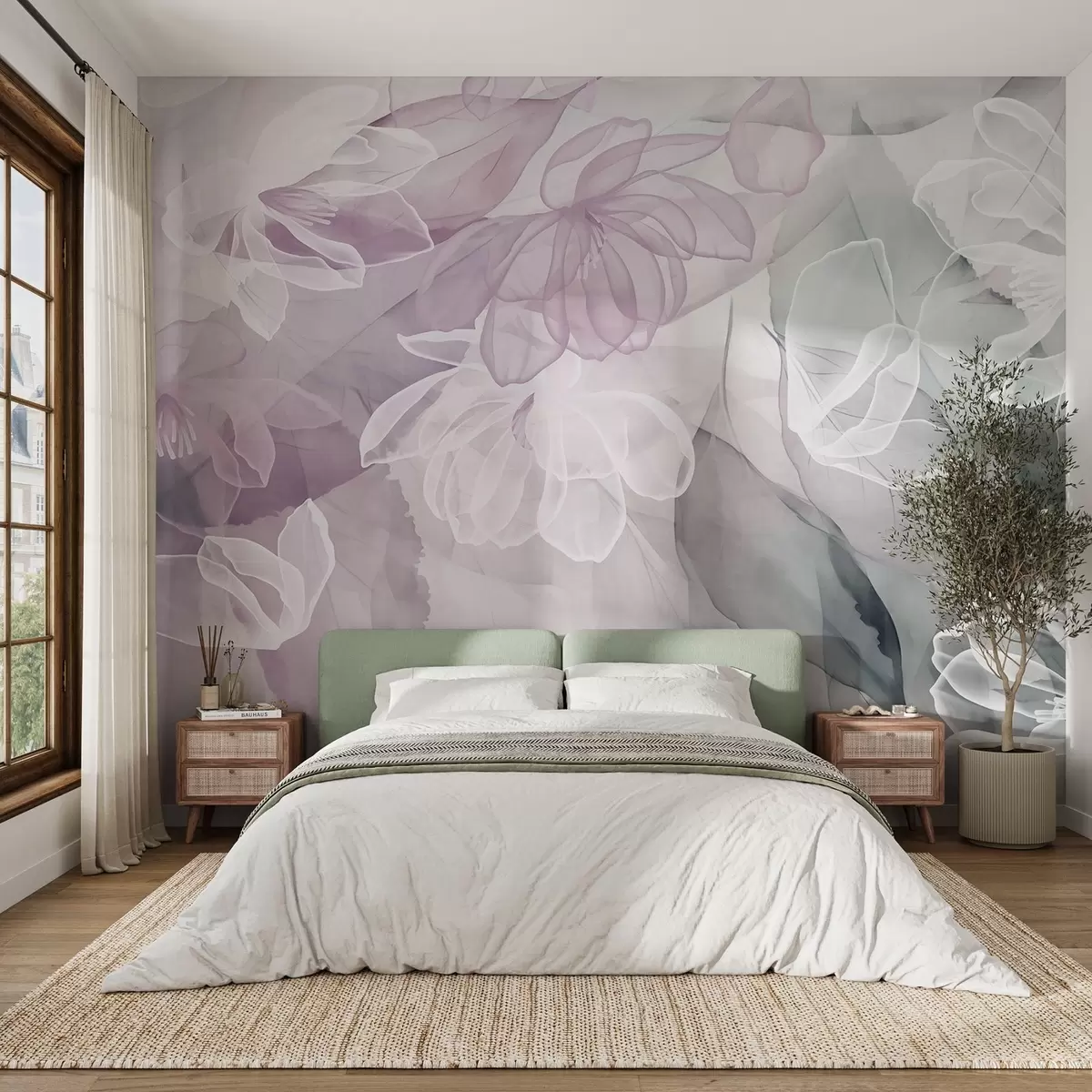 Фотошпалери Квіти і листя з прозорими пелюстками у відтінках білого, рожевого і зеленого, м'які і ніжні w09158v1