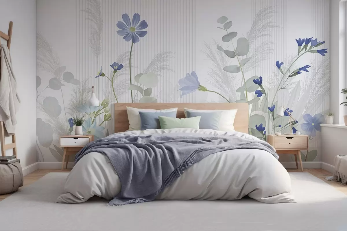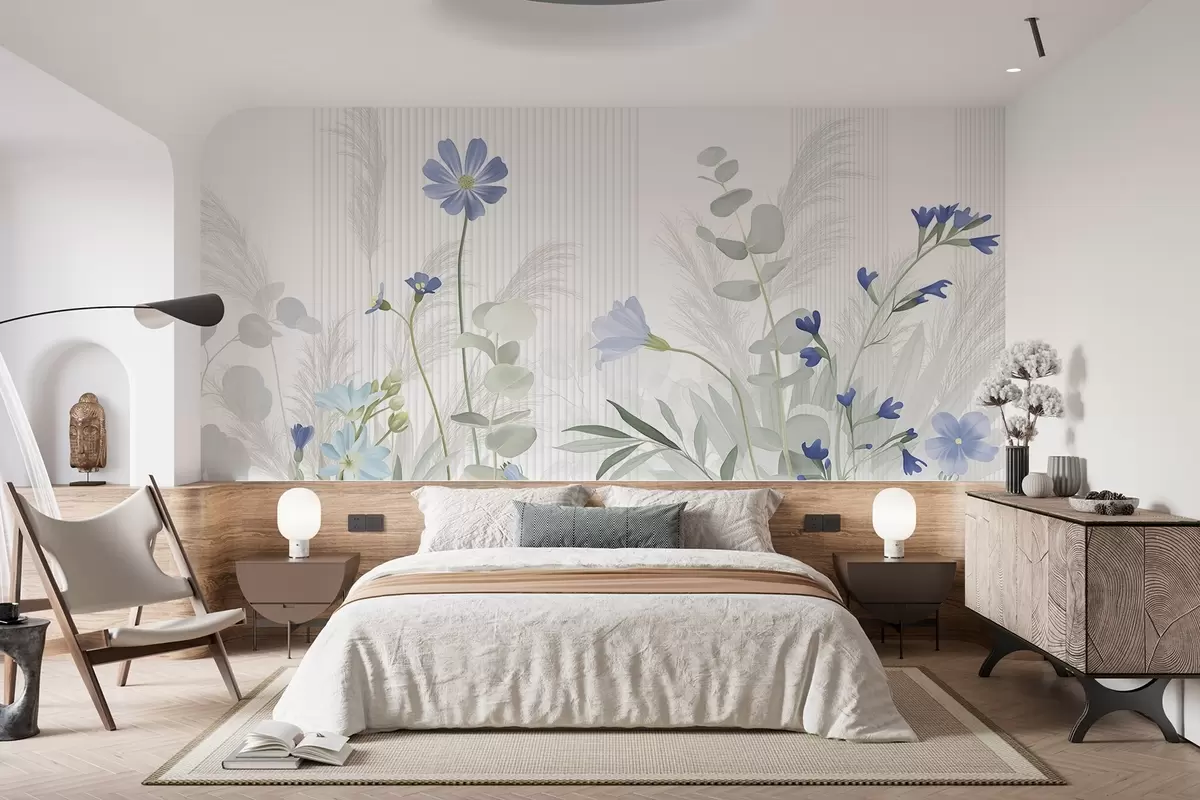 Фотошпалери Квіти в пастельних тонах, світло-зелене листя, білий фон з вертикальними лініями, елегантний і мінімалістичний w09161v1