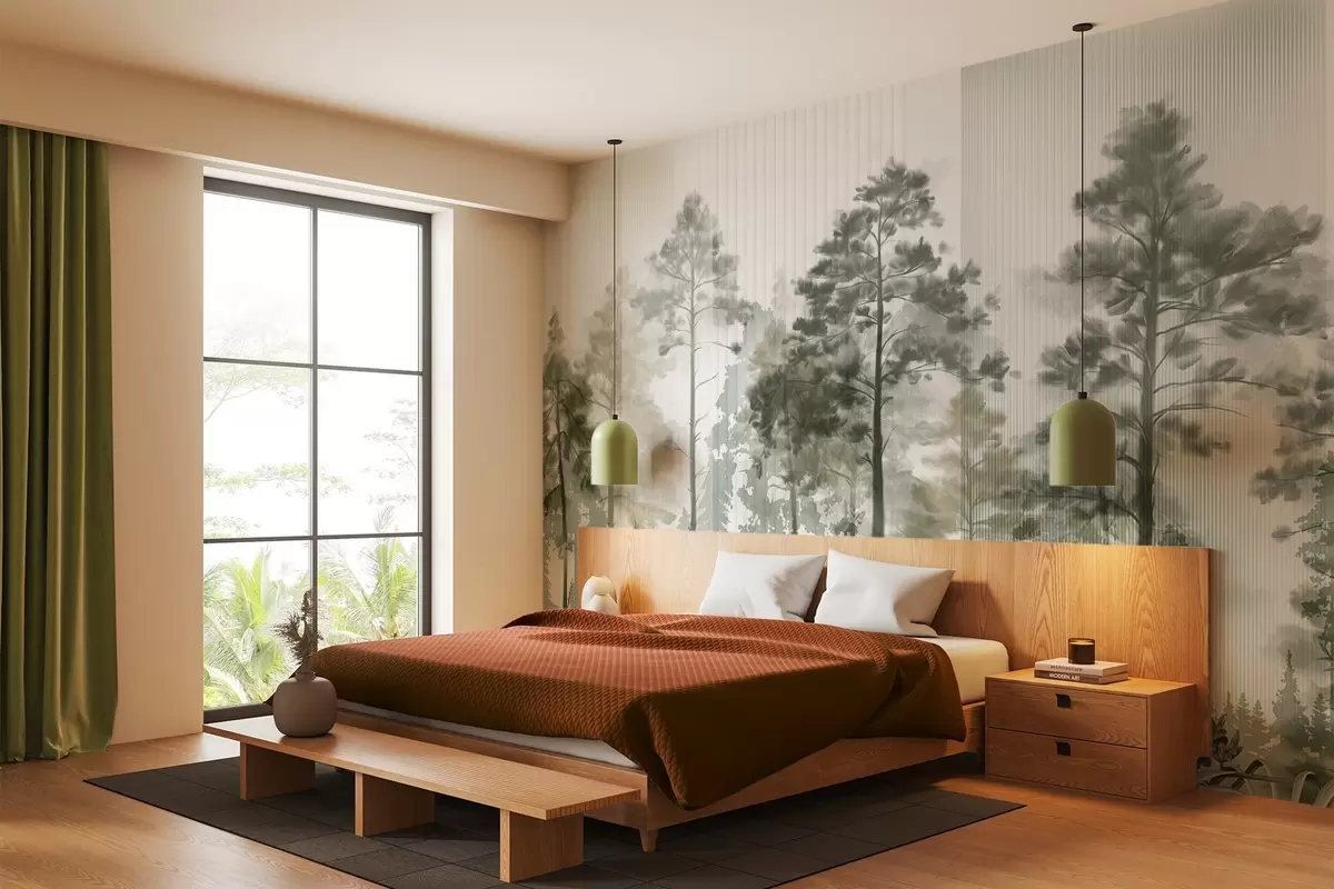 Фотошпалери Густий ліс з високими соснами, пишне зелене листя, туманна атмосфера з текстурами вертикальних ліній w09163