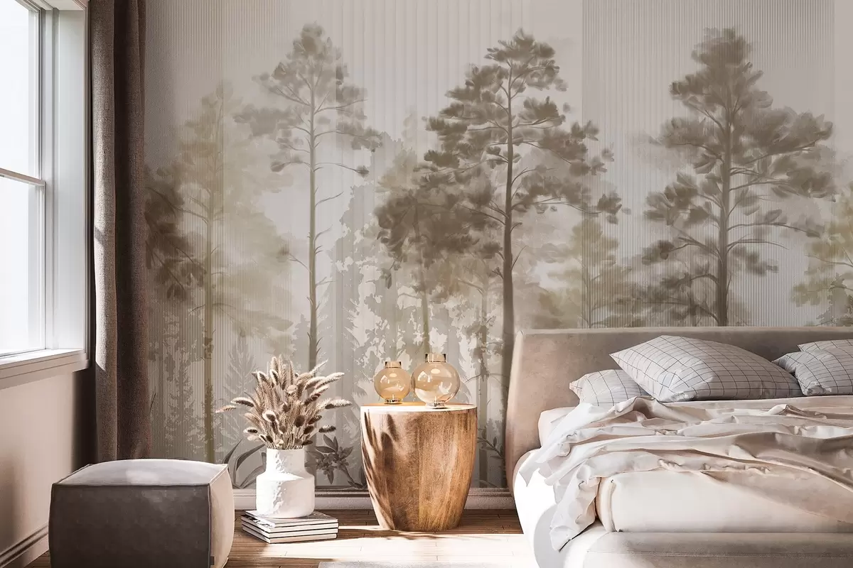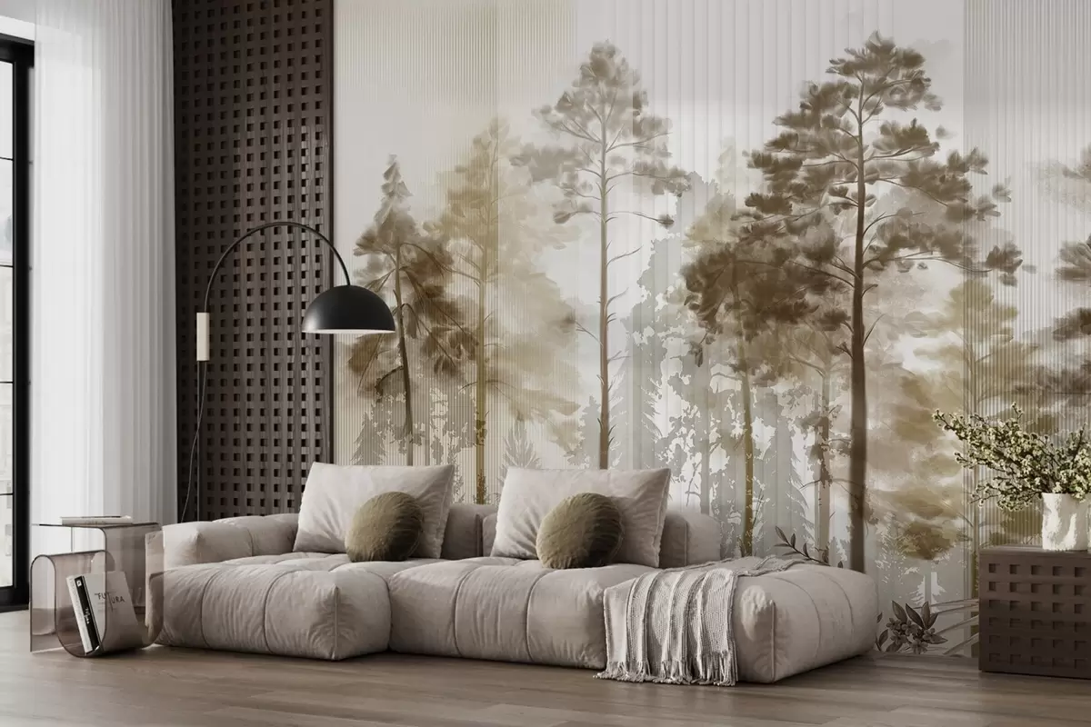 Фотошпалери Густий ліс з високими соснами, пишне бежеве листя, туманна атмосфера з текстурами вертикальних ліній w09163v1