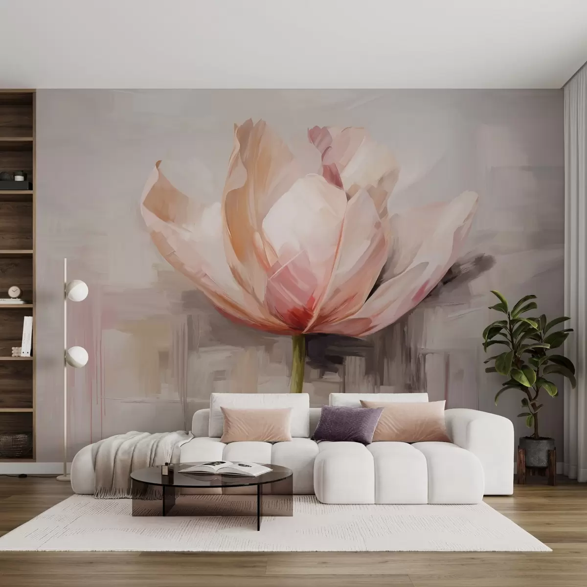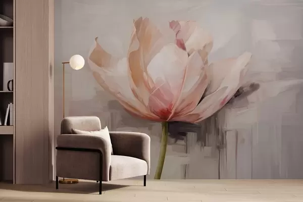 Фотошпалери Рожевий тюльпан, імітація олійного живопису м'якими мазками, абстрактне тло з пастельними відтінками сірого та бежевого w09187