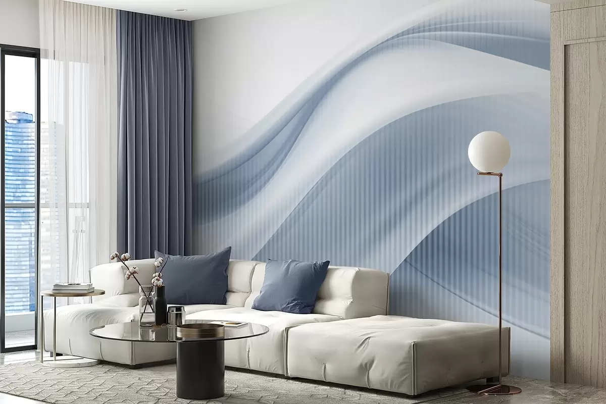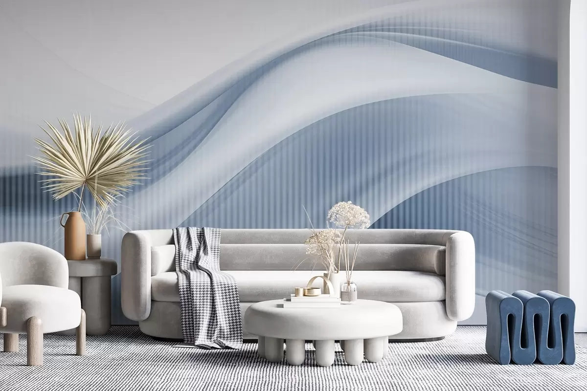 Фотошпалери Абстрактний принт з плавними лініями та тонкими вертикальними смужками, що створюють відчуття руху та глибини, синя палітра w09189v1
