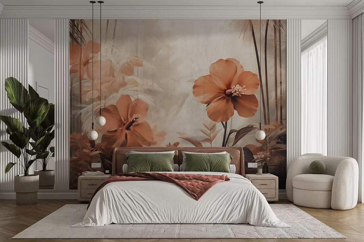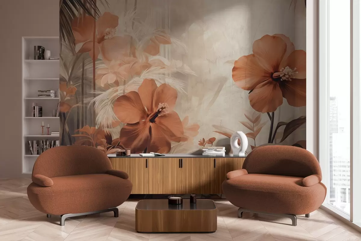 Фотошпалери Пастельно-червоні квіти гібіскуса з листям і стеблами, тропічна рослинність, м'які, приглушені кольори, вінтажний стиль w09203